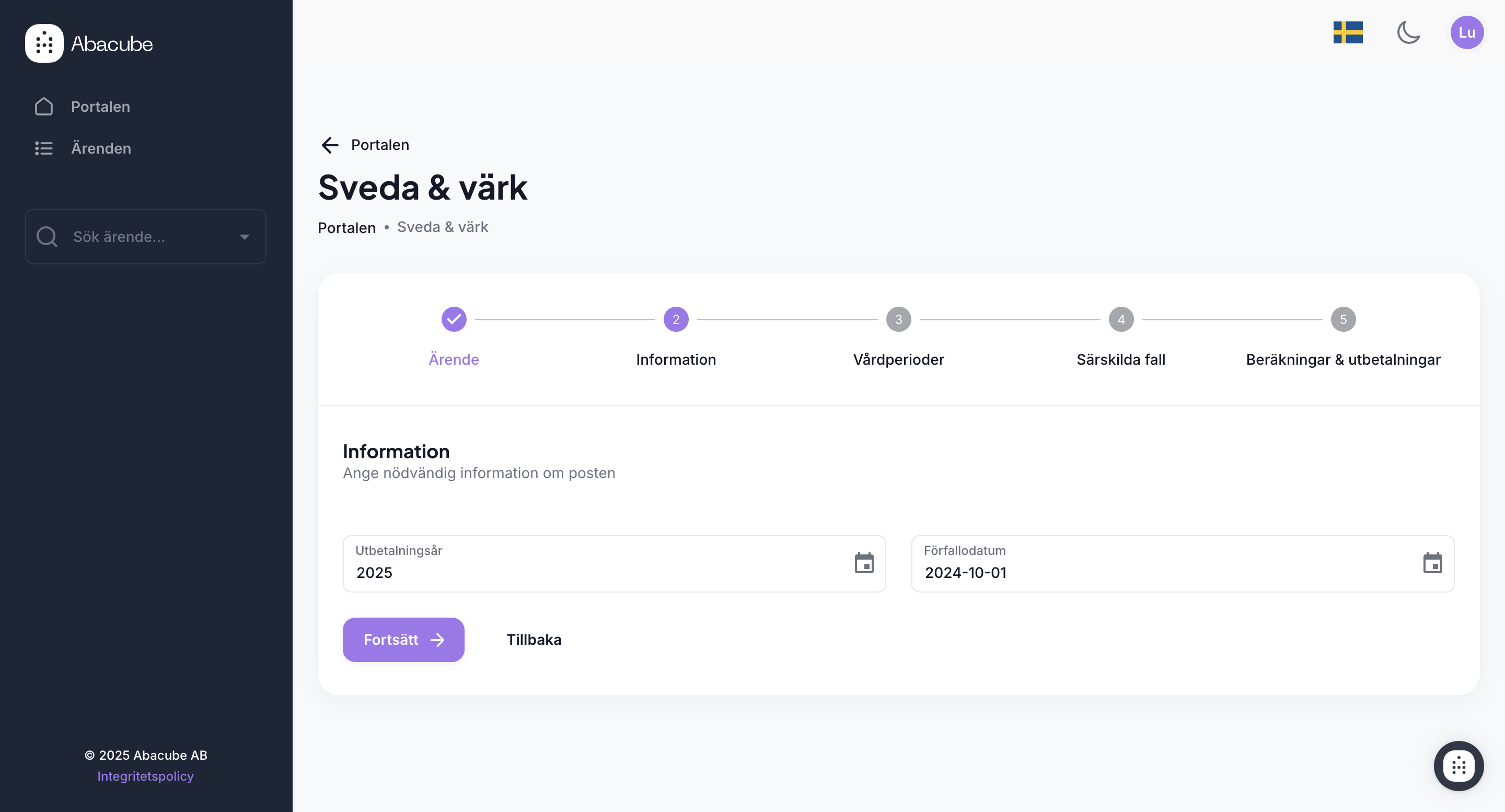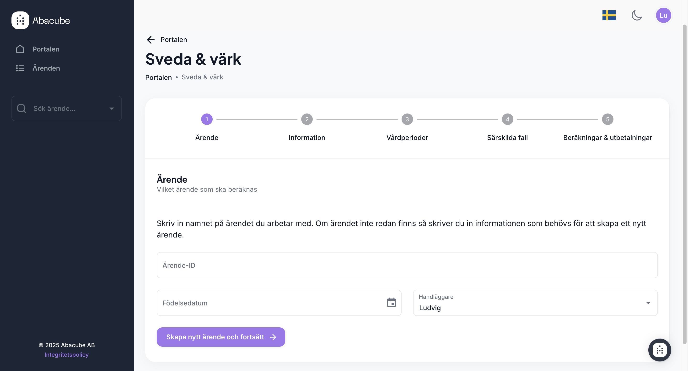 När vi klickat in på sveda & värk från portalen kommer vi till ett formulär med 5 steg som vi tar oss igenom i kronologisk ordning. Det första vi behöver när vi skapar en post är ett ärende-ID. Om det finns ett befintligt ärende kommer det att visas i listan när du anger ID:t. Om det är ett nytt ärende kommer det att skapas härifrån. När du gör en ny beräkning i ett befintligt ärende kopplas den automatiskt dit, och vi hämtar tidigare relevant information.