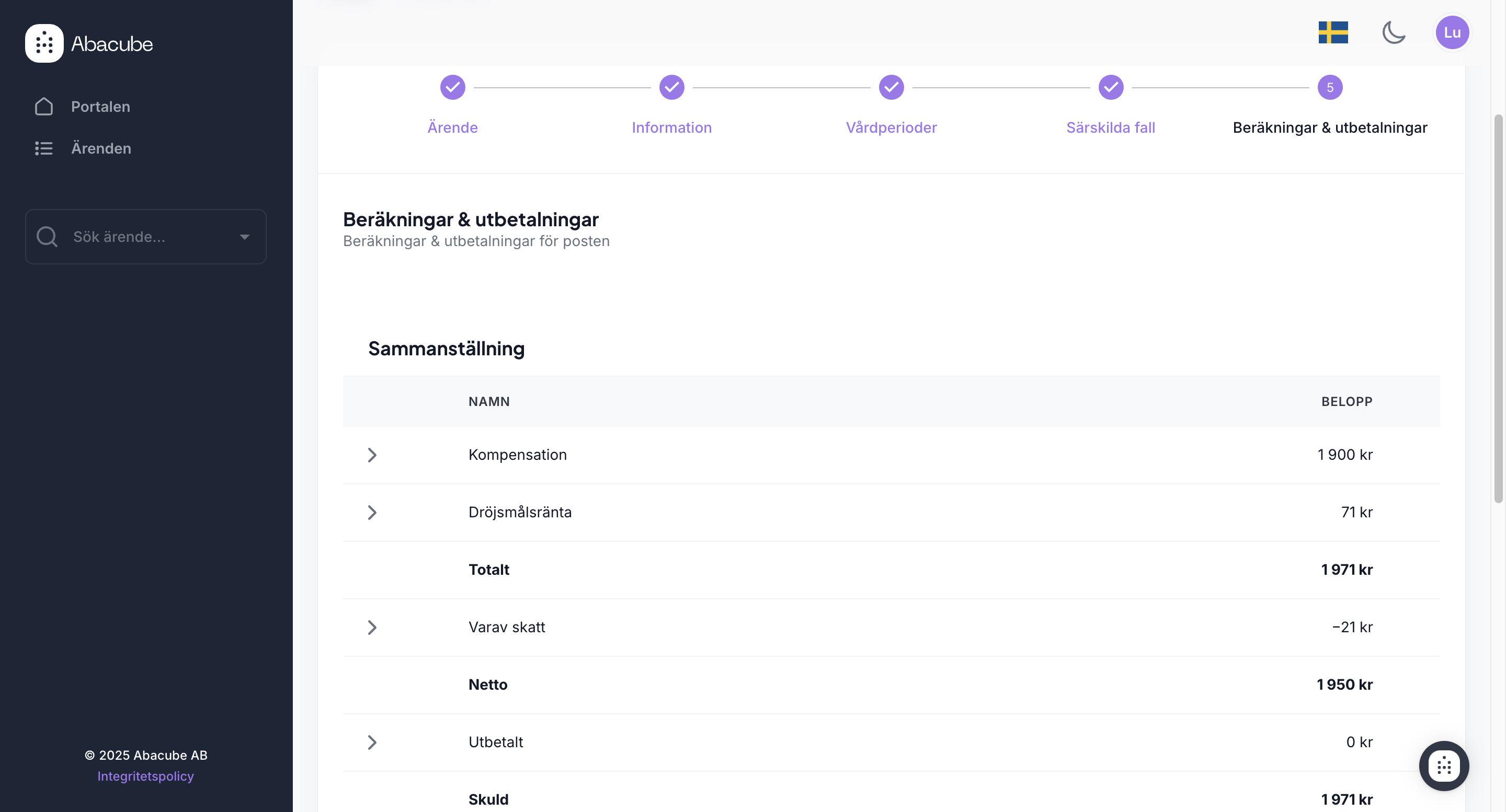 Sista steget, beräkningar & utbetalningar visar en sammanfattning av posten. Alla rader som har en pil på höger sida i tabellen går att expandera för att visa mer information.