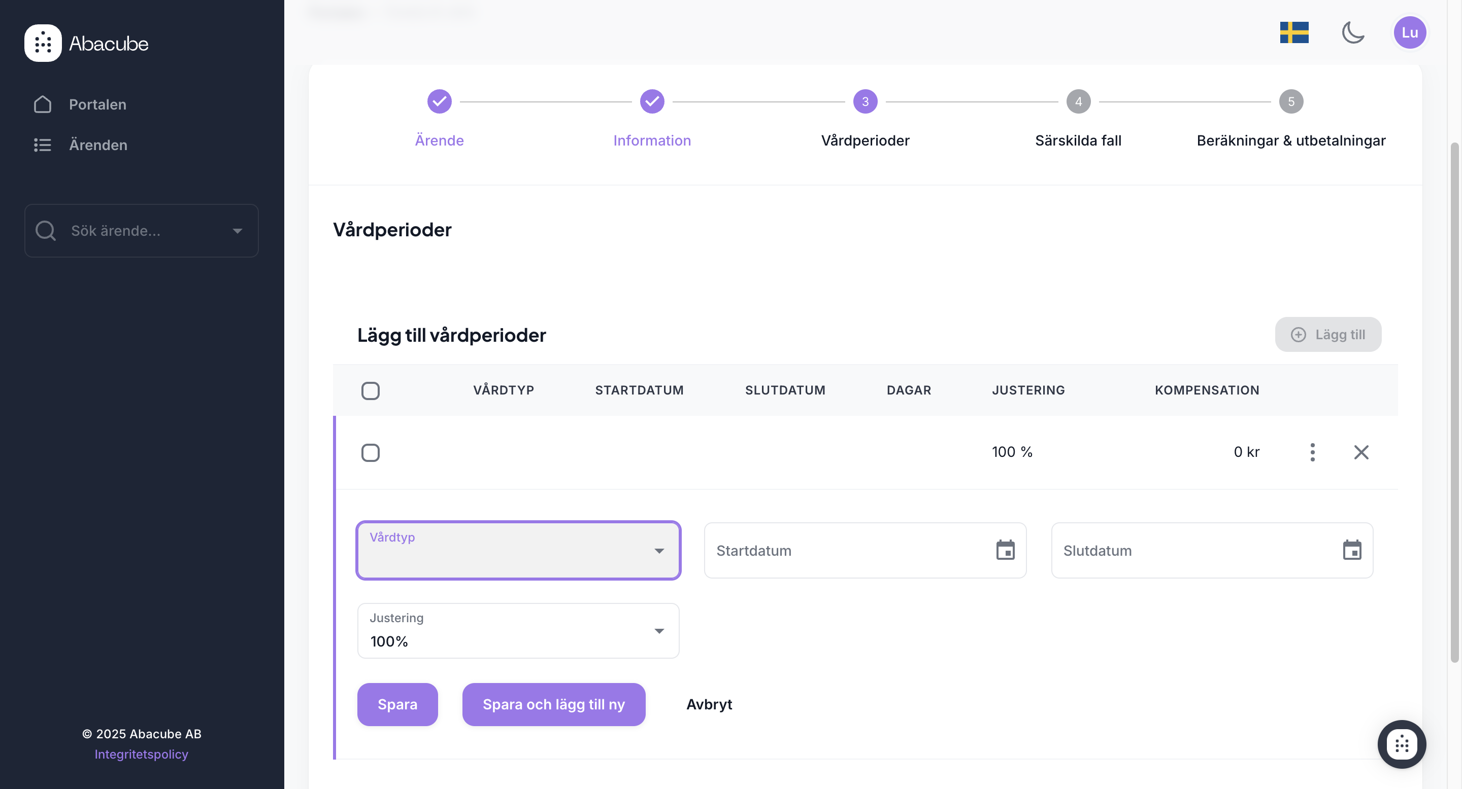 Därefter kommer ska vi lägga till vårdperioder, här väljer du vilken vårdtyp det rör sig om, samt vilken period respektive vårdperiod gäller, samt om det ska vara en justering under perioden. Det går enkelt att lägga till fler vårdperioder som följer efter varandra.