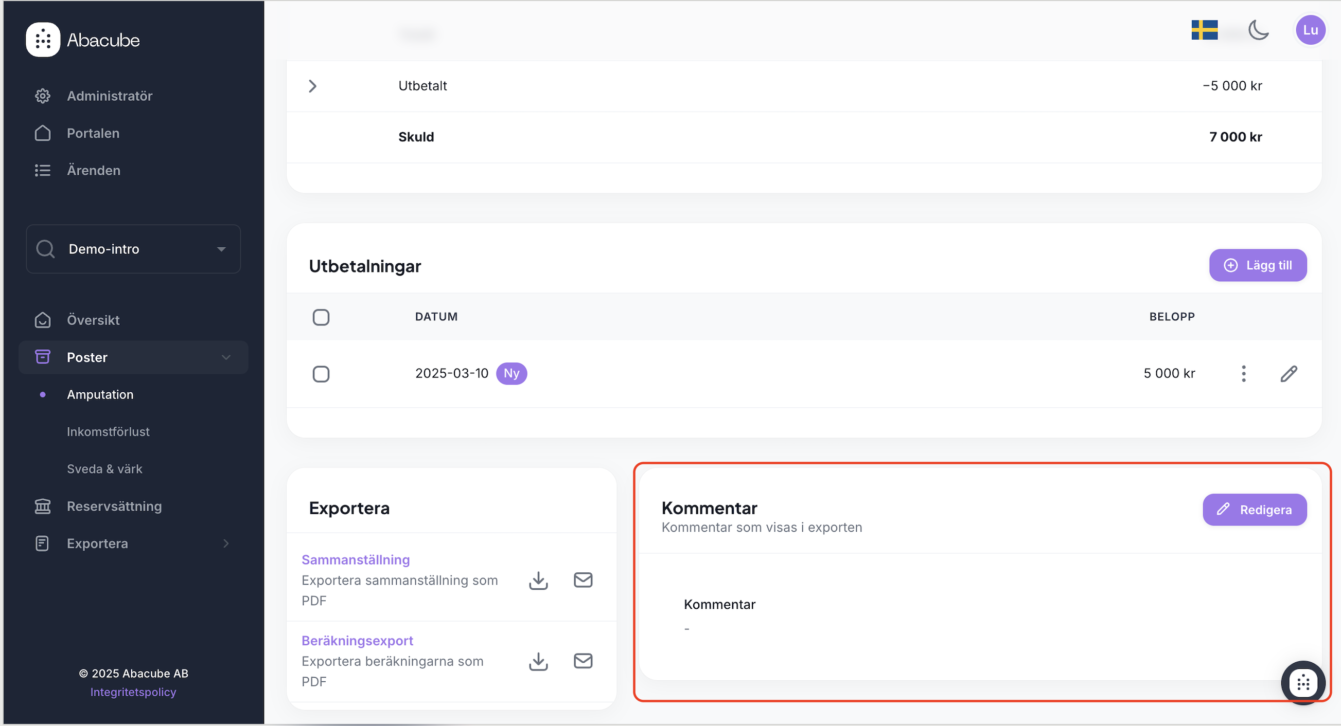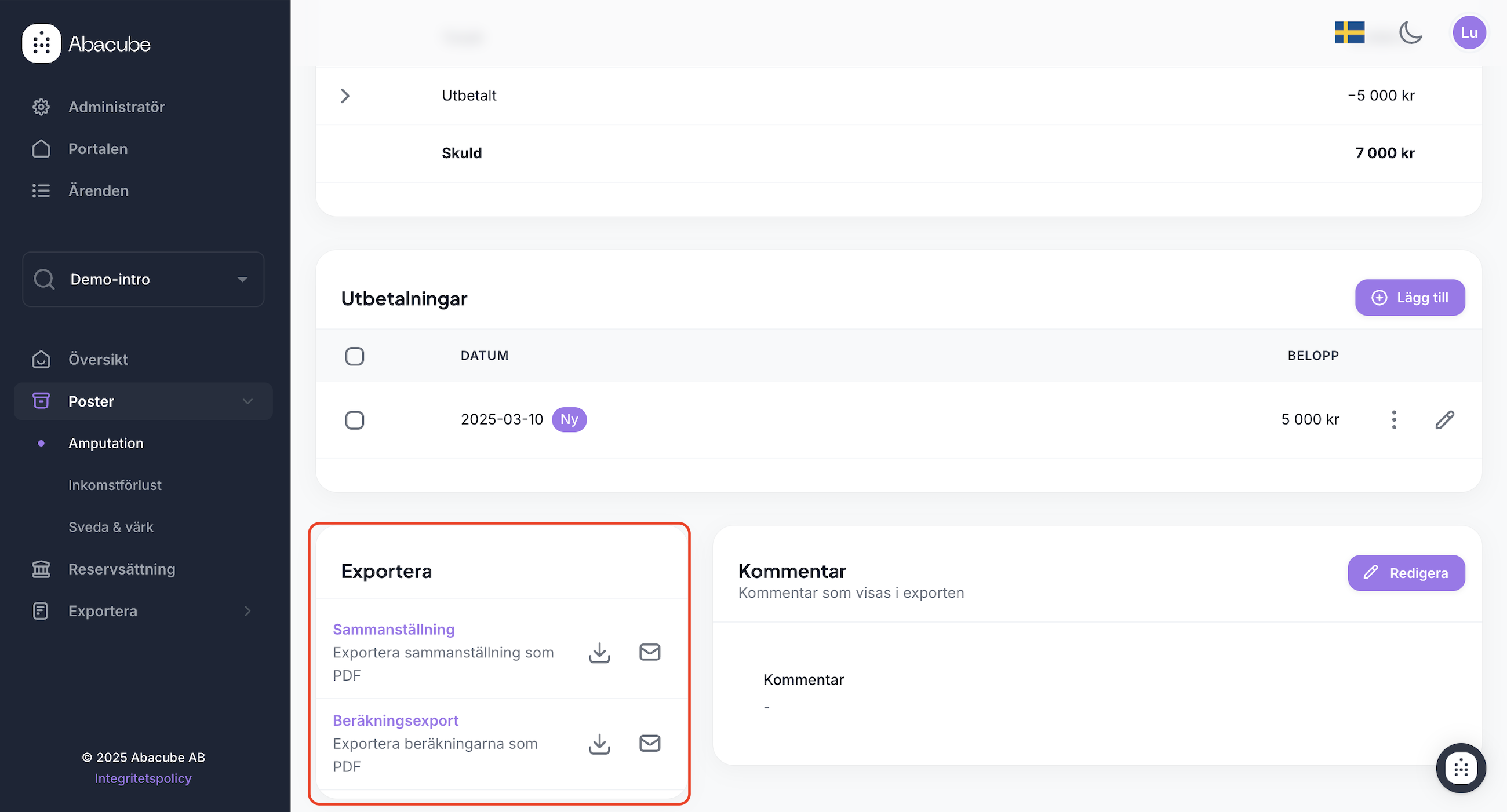 Här kan ni ladda ner exporter av ärendet, de finns i två olika nivåer, sammanställning och beräkningsexport. Sammanställningen är en uppställning av hela posten som kan skickas till skadedrabbad, den innehåller inga detaljer om hur beräkningarna är gjorde, utan en övergripande redovisning av posten.