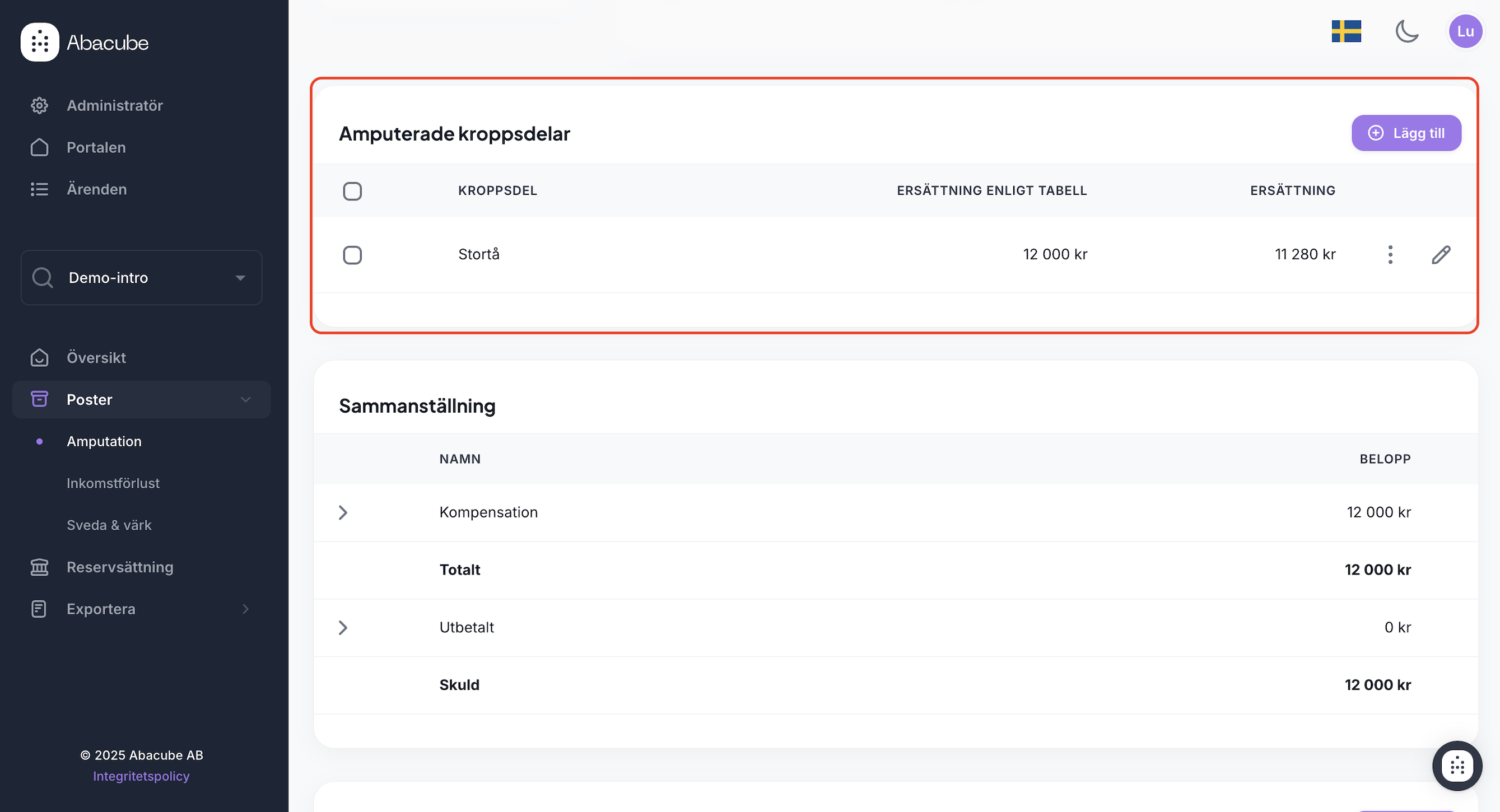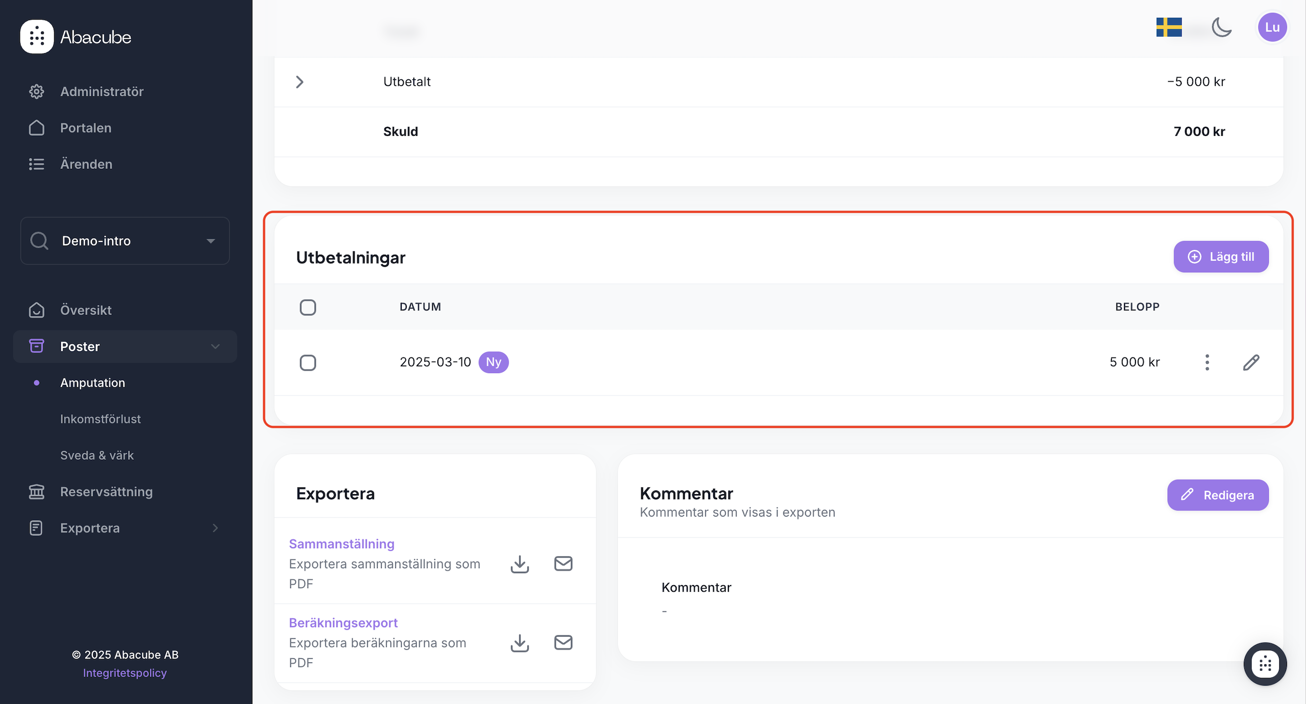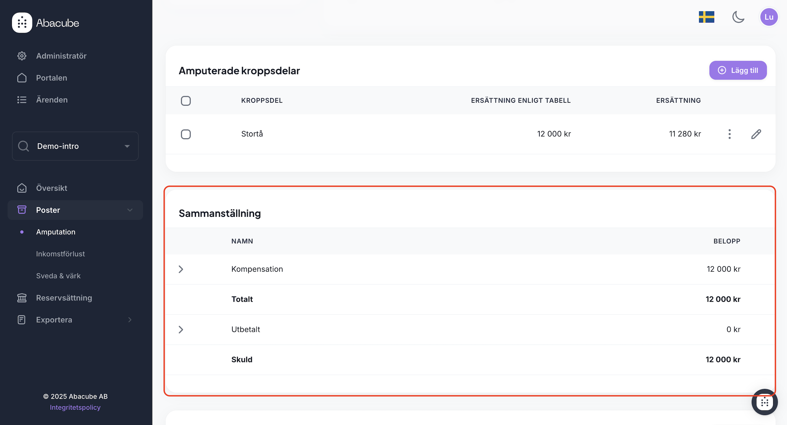 Därefter kommer vi till en sammanställning där vi redovisar ersättningen för posten, här ser vi den totala kompensationen, eventuell dröjsmålsränta, eventuella utbetalningar som vi lagt in, och därefter utestående skuld.