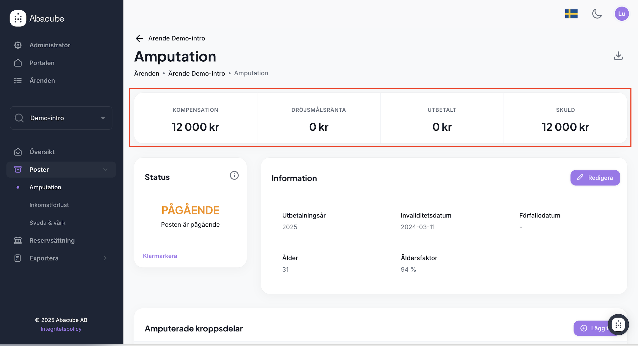 Här ser vi information om ersättningen för posten, en snabb sammanfattning om kompensation, eventuell dröjsmålsränta, utbetalningar och utestående skuld.