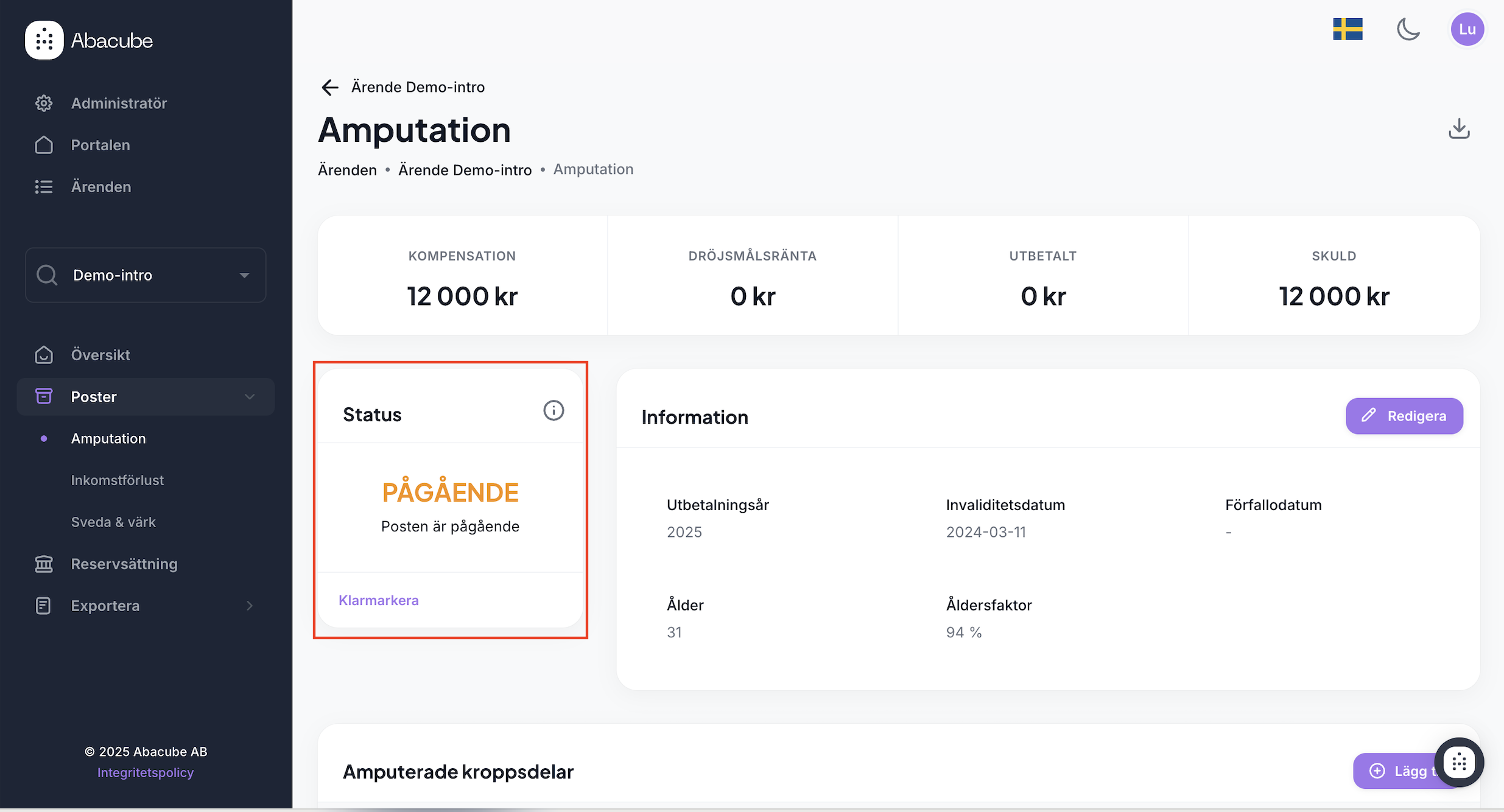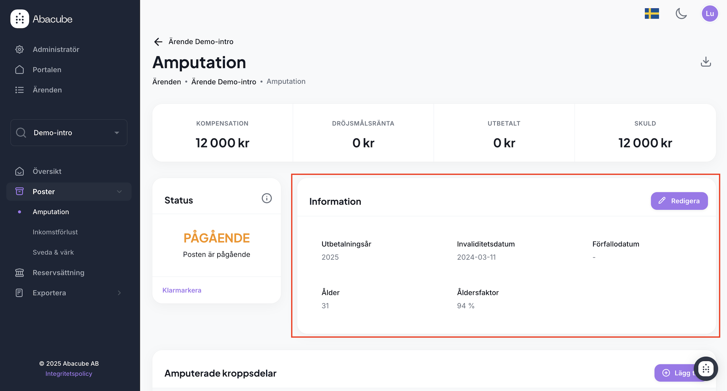 Här har vi övergripande information och förutsättningar för att beräkna posten, exempelvis utbetalningsår, invaliditetsdatum eller förfallodatum. Klicka på redigera uppe till höger för att när som helst redigera informationen här.