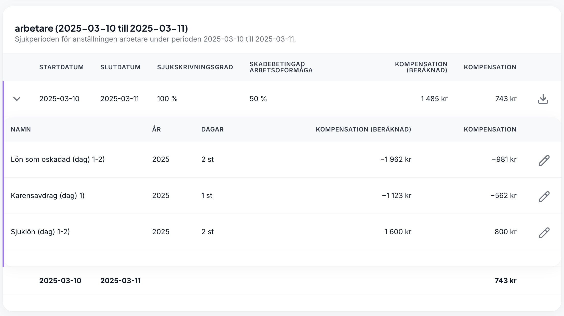 Vill man göra justeringar på en rad, så gör man det som vanligt via pennan och man fyller då i det totala beloppet för perioden, detta belopp kommer multipliceras med graden för skadebetingad arbetsoförmåga.