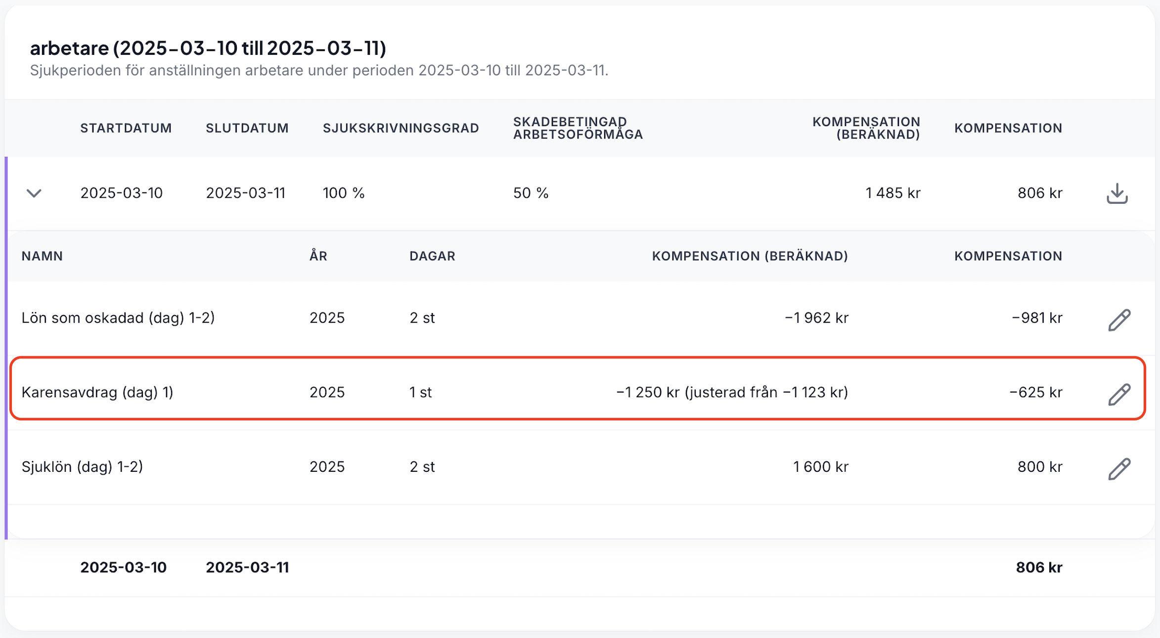 Som i exemplet ovan så redovisas den beräknade kompensationen vid 100% i kollumnen Kompensation beräknad och det reducerade beloppet i kollumnen Kompensation.