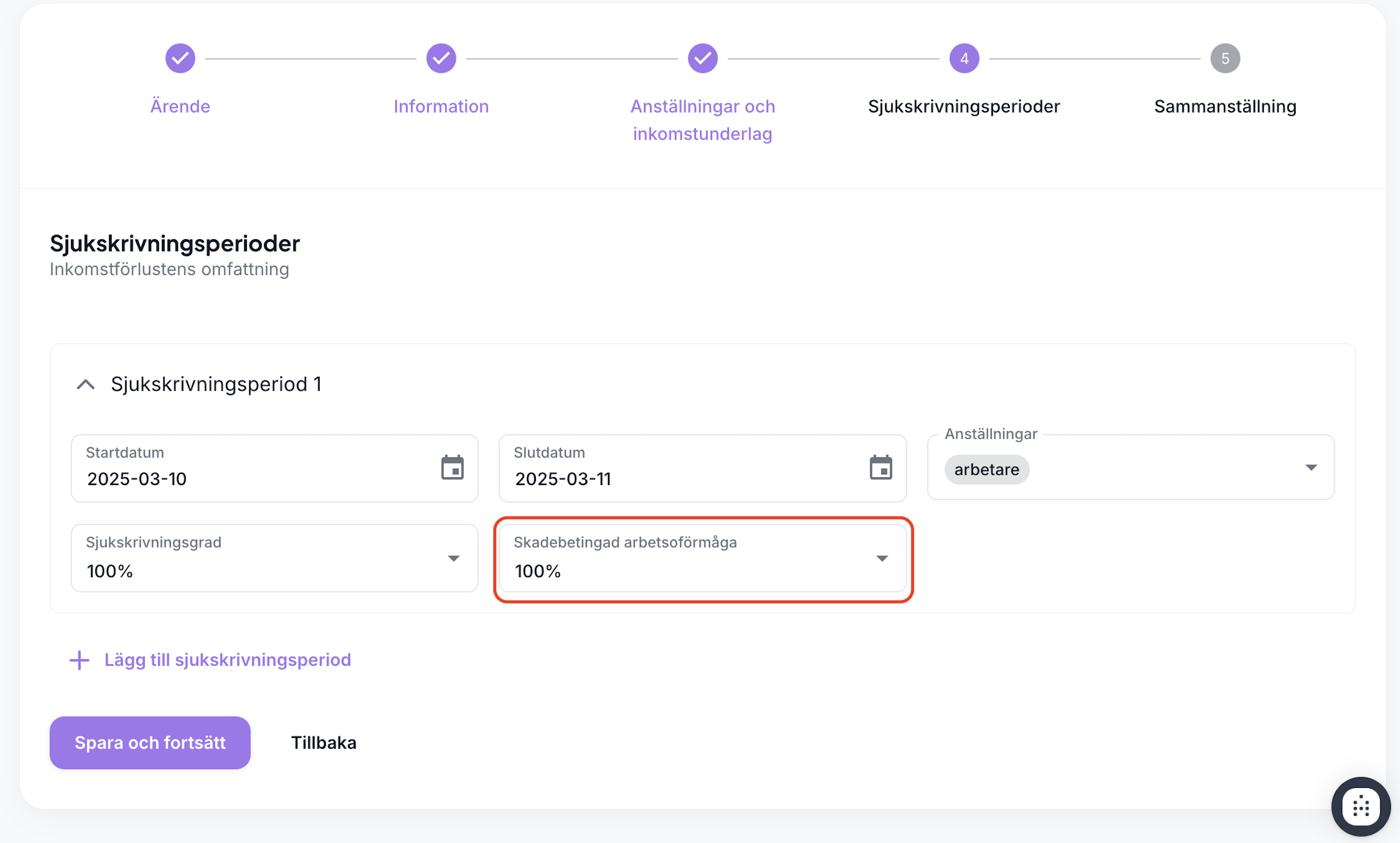 Vid inkomstförlust är det möjligt att välja 100%, 75%, 50%, 25% skadebetingad arbetsoförmåga vid sjukskrivningsperioder. Detta om det exempelvis rör sig om ett vårdolycksfall eller om det finns andra konkurrerande skador som ej är skadebetingade.