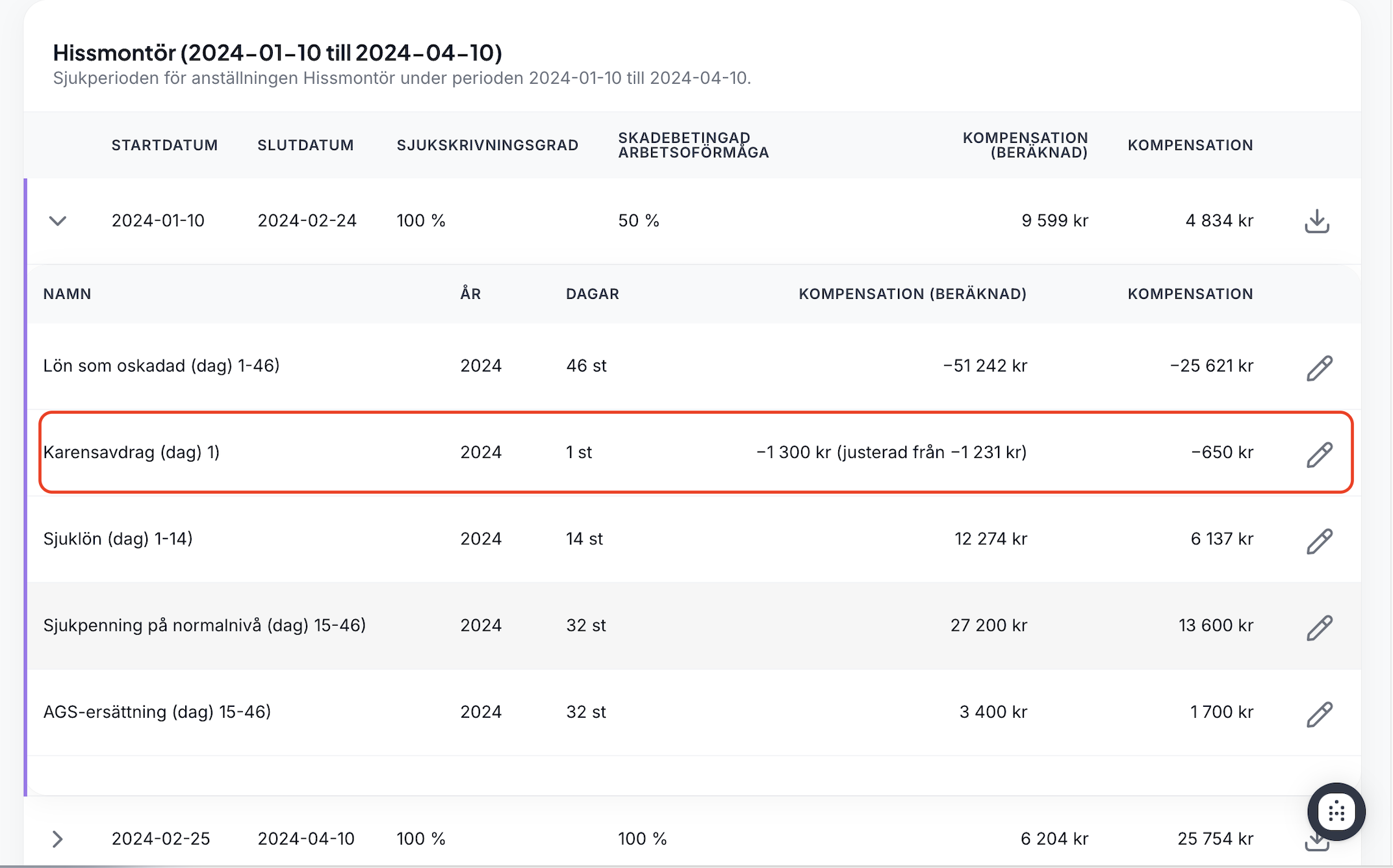 Vill man göra ändringar i en rad går det att göra precis som vanligt, att tänka på då är att det belopp man lägger in kommer multipliceras med sjukskrivningsgraden. Vill man exempelvis ändra karensavdraget i tabellen ovan från -1231kr till -1300kr är så fyller man i det, och samordningsbara kompensationen blir då 650kr.
