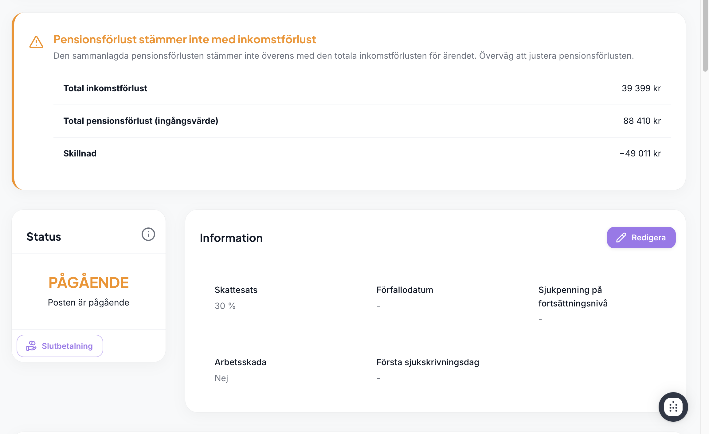Vid beräkning av pensionsförlust finns en koppling till inkomstförlust. Systemet känner nu automatiskt av om värdet av den angivna inkomstförlusten i pensionsförlusten skiljer från den framräknade inkomstförlusten och systemet kommer uppmana er om att uppdatera värdet i pensionsberäkningen. Detta gäller både nya och gamla ärenden där det finns en differens mellan den beräknade inkomstförlusten och inkomstförlusten som används till grund för pensionsberäkningen. Detta är inte tvingande, utan snarare ett hjälpmedel för att undvika felberäkningar. Extra hjälpsamt om man exempelvis har gjort en pensionsförlustberäkning, och sen gör en justering i inkomstförlustberäkningen.