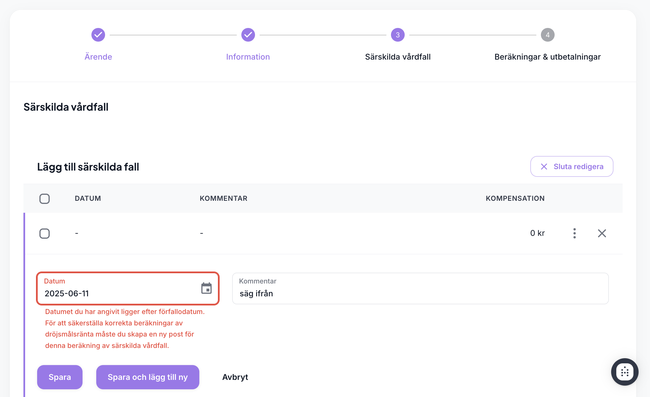 Det är inte längre möjligt att registrera särskilda vårdfall med datum som infaller efter förfallodatum. Detta för att säkerställa att dröjsmålsräntan beräknas korrekt. Om du behöver lägga till ytterligare vårdfall som ligger efter förfallodatum ska du istället skapa en ny post för särskilda vårdfall.