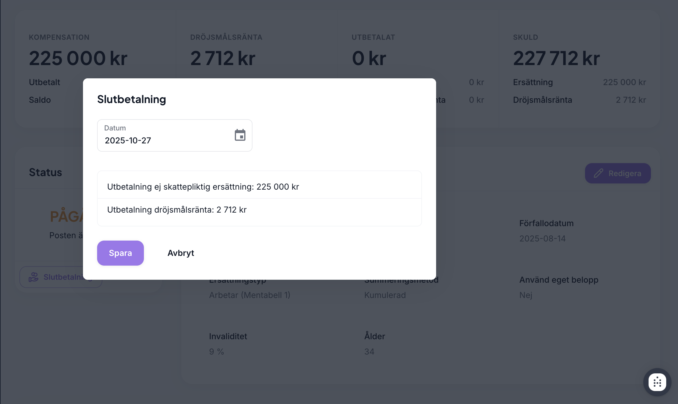 Därefter dyker dialogrutan för slutbetalning upp, där ni kan anpassa datumet för att få korrekt dröjsmålsränta beräknad.