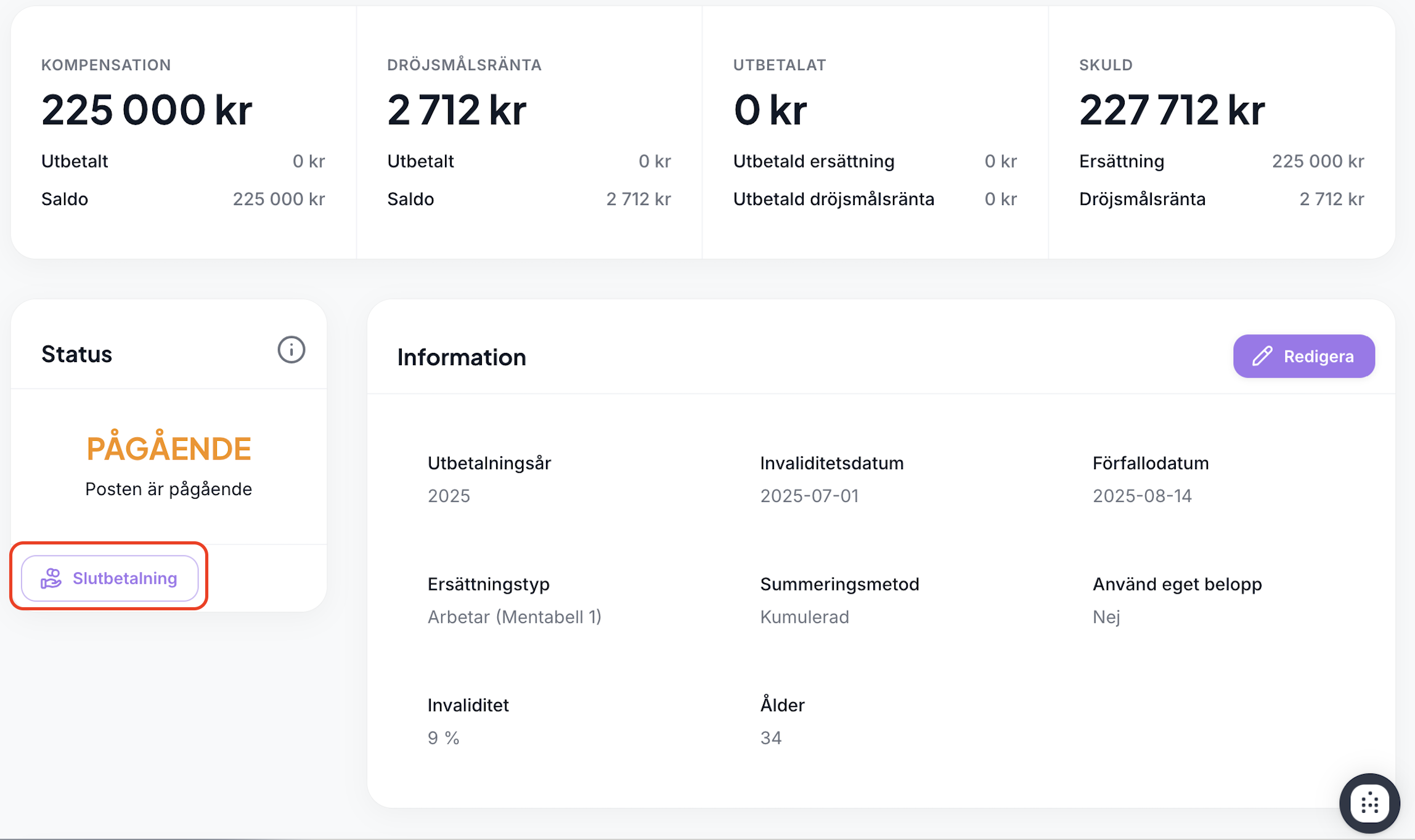 Vi har uppdaterat logiken för hur status hanteras vid slutbetalning. När en slutbetalning genomförs ändras postens status automatiskt till Slutbetald istället för tidigare “Klar”.