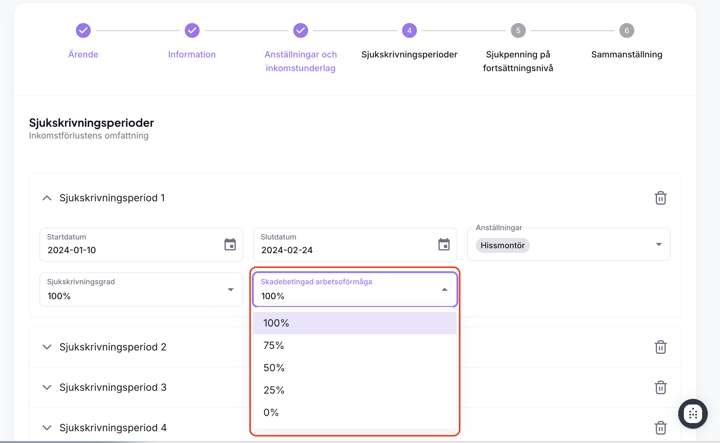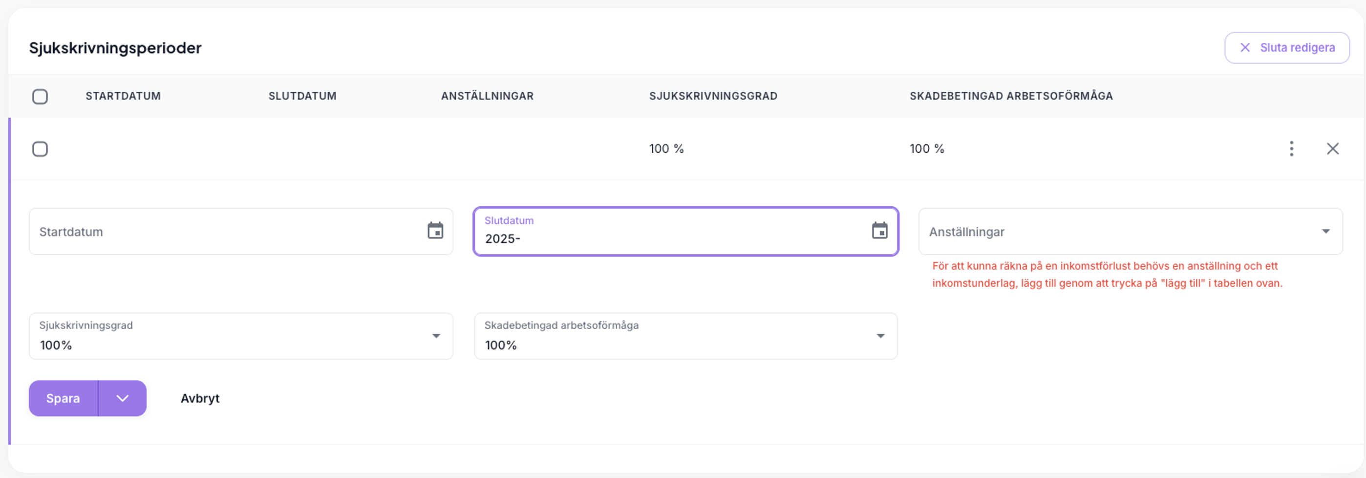 Därefter kan du fortsätta som vanligt genom att lägga till sjukskrivningsperioder. Om du försöker lägga in sjukskrivningsperioder utan att först ha registrerat anställning och inkomstunderlag, kommer systemet nu att vägleda dig till att komplettera dessa uppgifter innan du kan fortsätta med beräkningen.