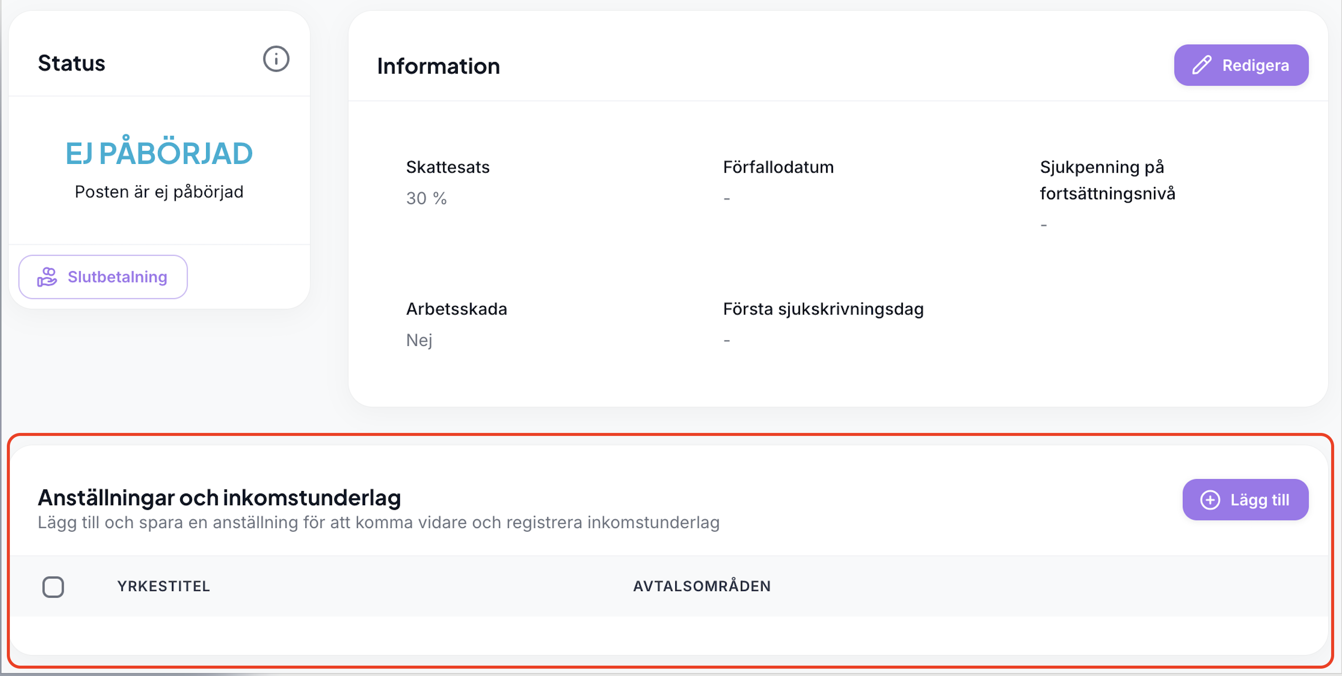 När man vill räkna på en inkomstförlust direkt via ett ärende har vi nu gjort flödet tydligare för var grunddata ska hanteras. Det är enklare att se vilka uppgifter som krävs för att kunna påbörja beräkningen. Vi har ändrat namnet från Anställningar till Anställningar och inkomstunderlag, samt lagt till en förklarande hjälptext som beskriver vad som ska fyllas i.