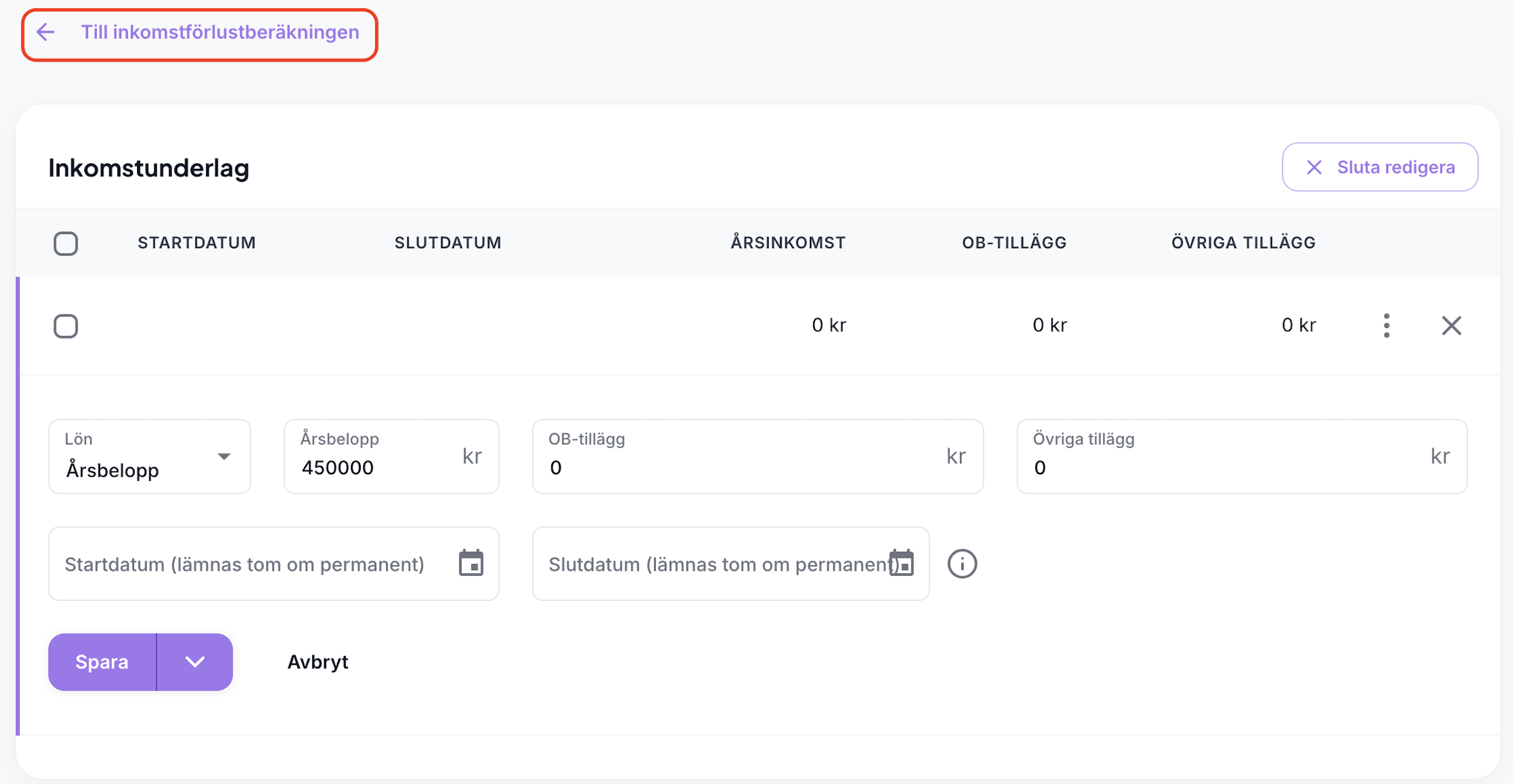 Därefter kommer du till översikten för anställningen, detta skede kan du fylla i inkomstunderlag och eventuellt semesterunderlag. När allt är ifyllt och sparat väljer du Till inkomstförlustberäkning för att återgå till sidan för beräkningen. Skillnaden nu är att du har alla nödvändiga uppgifter om anställning och inkomstunderlag på plats.