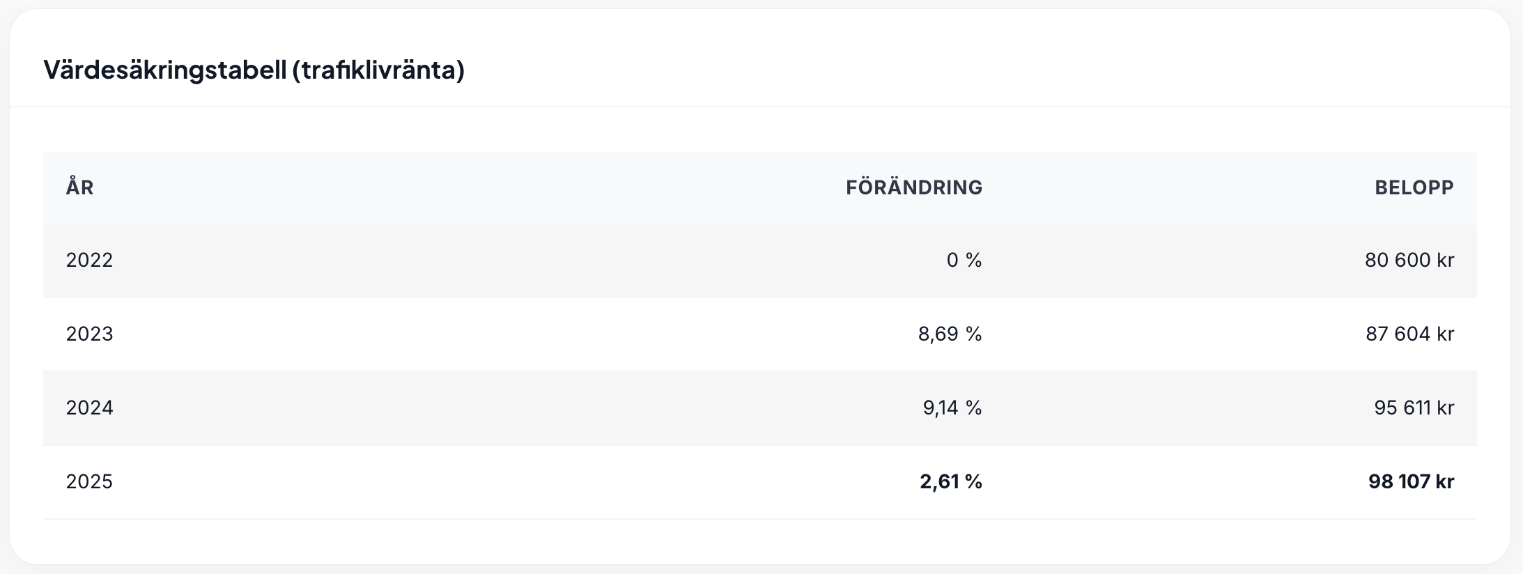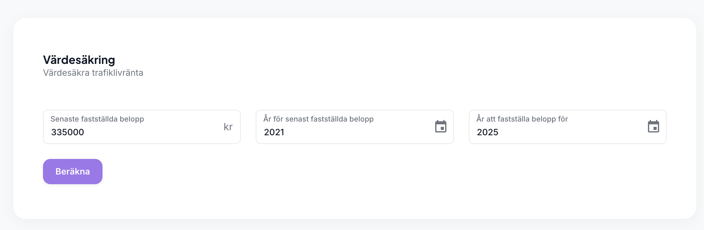 Värdesäkringen av trafikskadelivränta är en engångsberäkning som ni hittar längst ned på portalen. För att göra en beräkning fyller ni i det senast fastställda beloppet, år när det beloppet fastställdes samt till vilket år vi ska värdesäkra för.