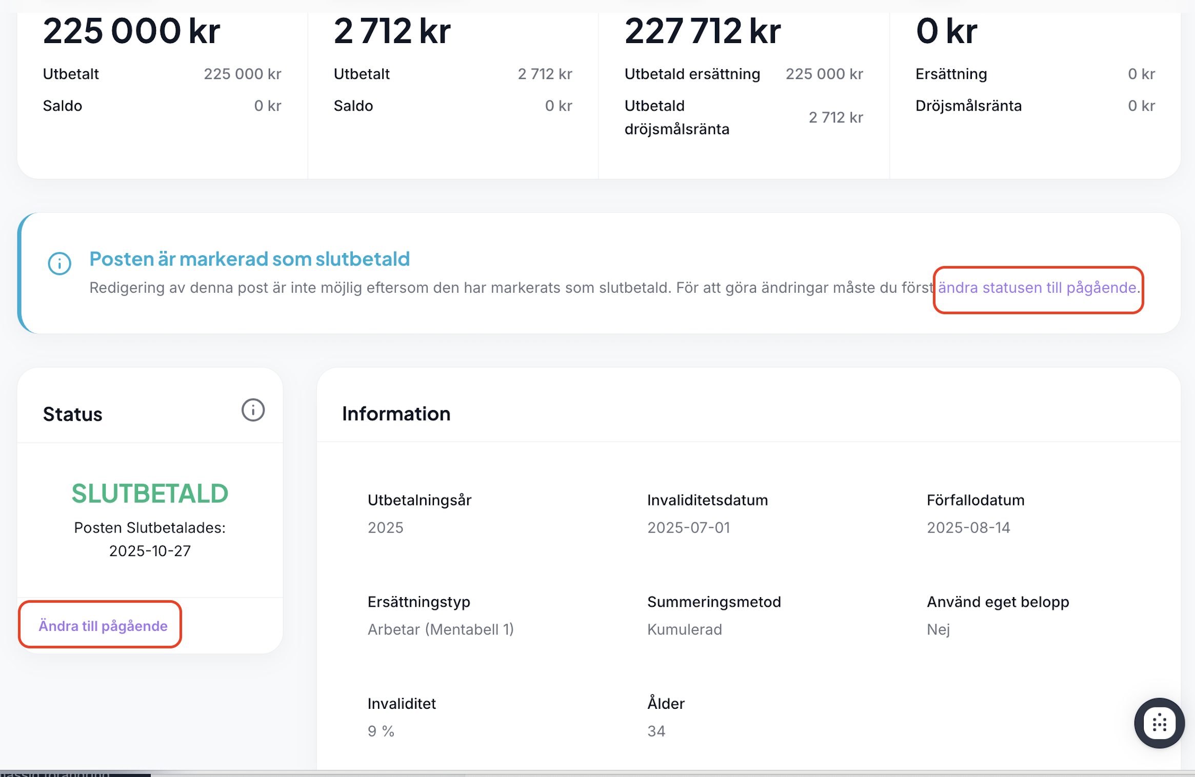 När en post har status Slutbetald kan inga ytterligare justeringar göras i beräkningen utan att öppna posten igen. Du kan dock alltid visa posten för att granska informationen eller följa upp tidigare beräkningar.
