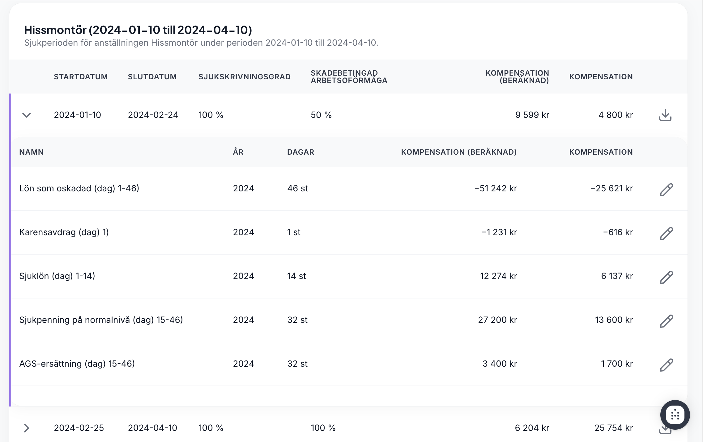 Om vi exempelvis sätter 50% under en period, kommer systemet automatiskt reducera ersättningen med hälften för dessa perioder. I sammanställningarna redovisas den beräknade kompensationen som vanligt i en egen kollumn, detta är det framräknade beloppet innan justering. I kollumnen Kompensation längst till höger redovisas det justerade beloppet.