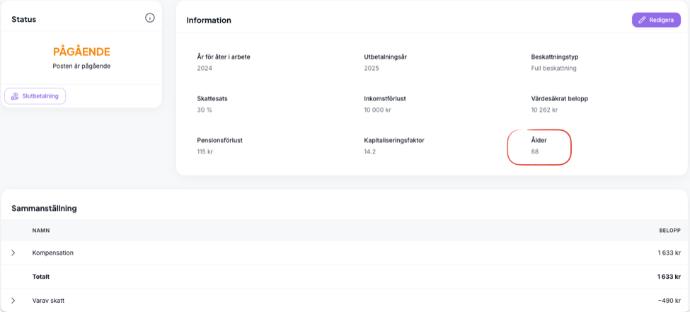 Välj Visa posten för att se beräkningen i sin helhet. Här får du tillgång till den detaljerade beräkningsvyn, möjlighet att exportera beräkningsexport samt att vid behov justera uppgifter.
